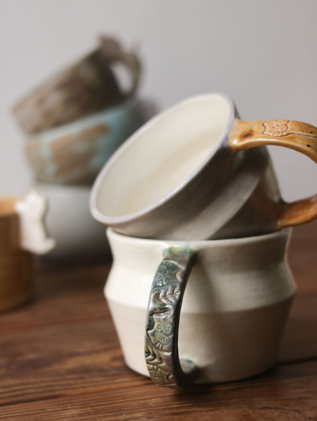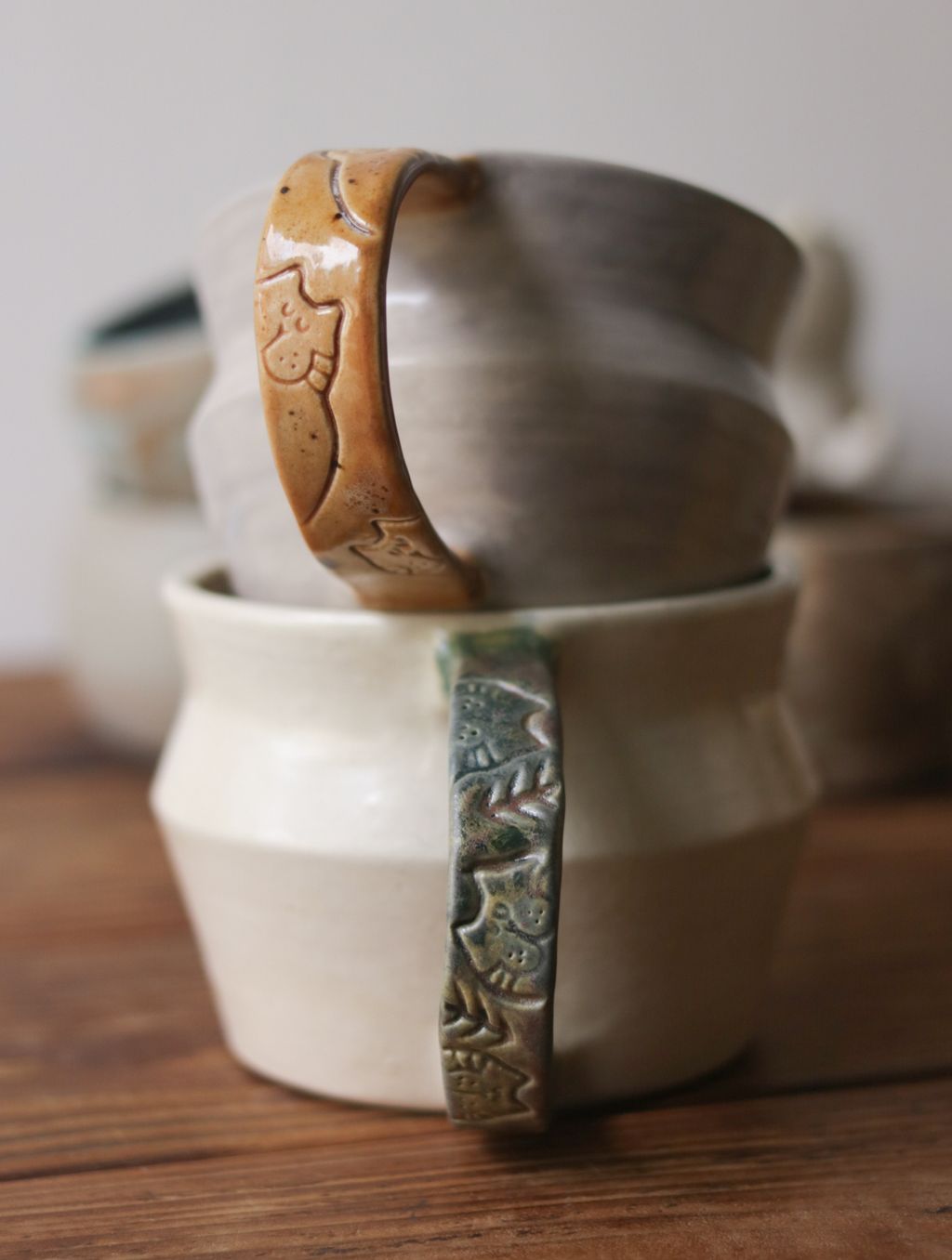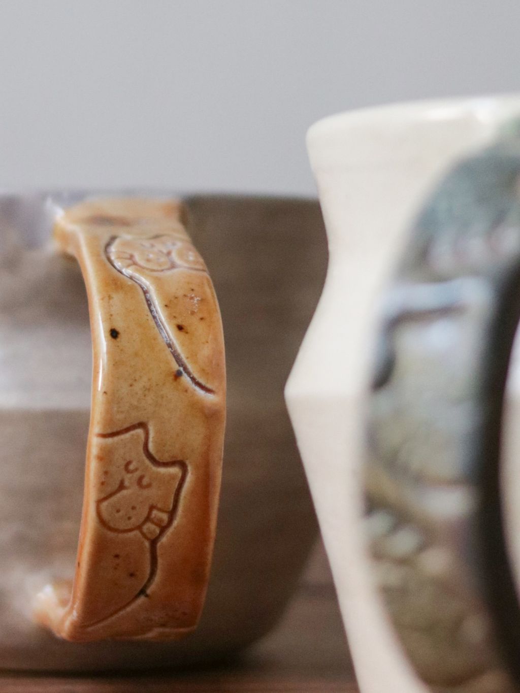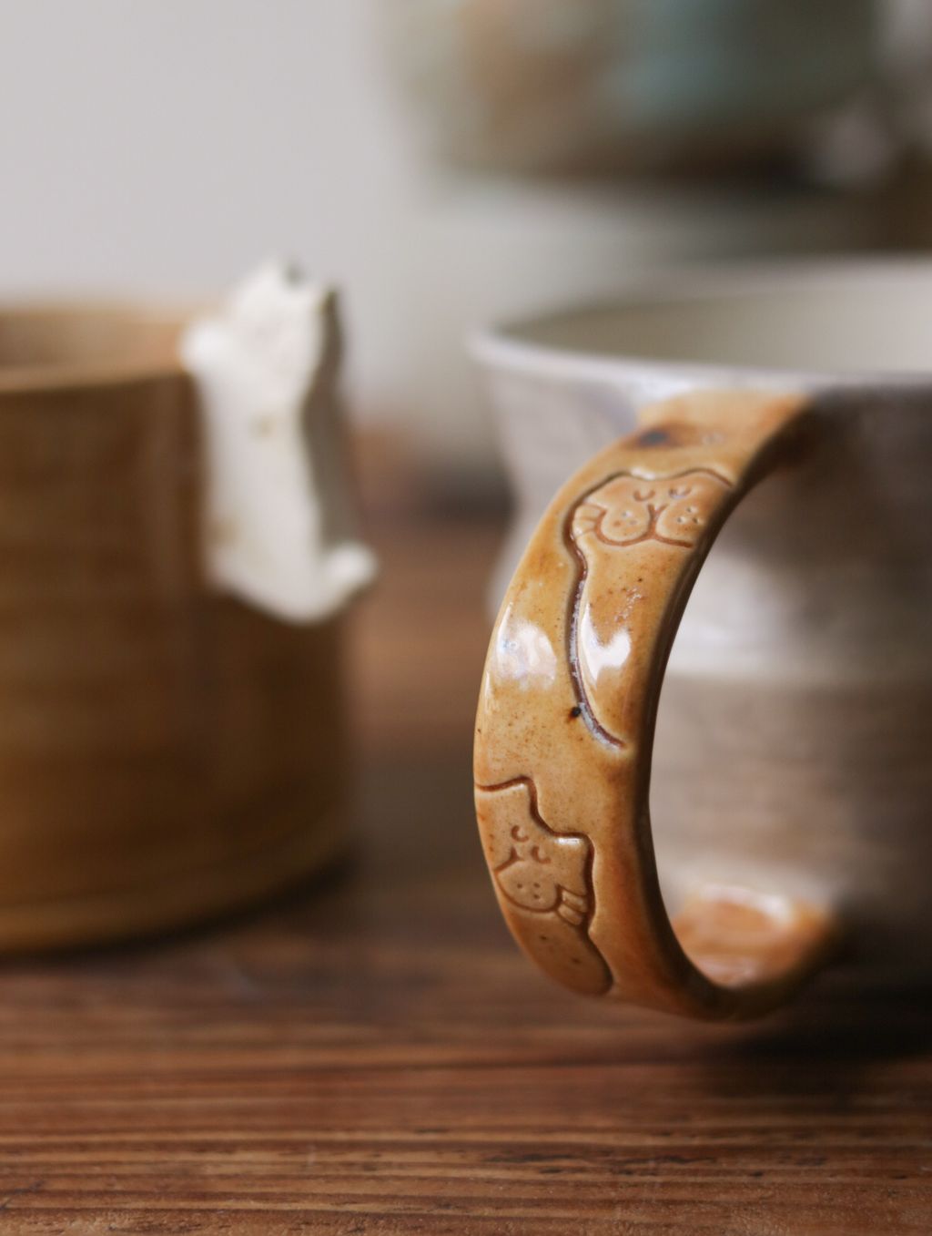 素雅的陶杯器型,以及在手柄處刻畫一點吉普貓、聖誕樹的紋樣,讓生活器皿增添一點可愛的元素。